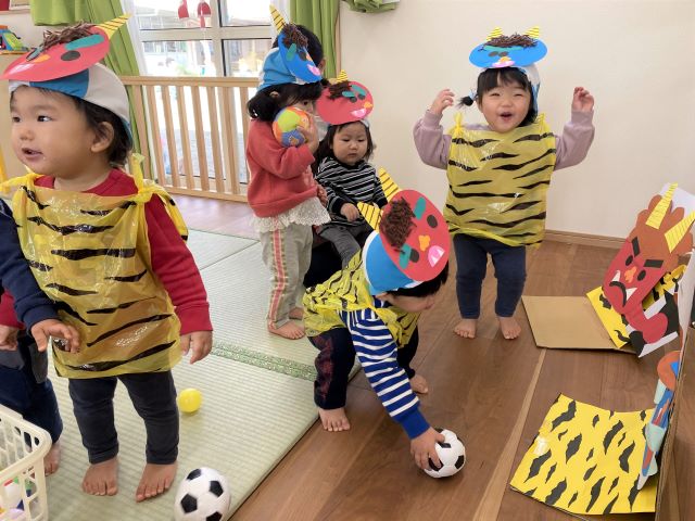 小さいクラスは、可愛い鬼退治ゲーム、年少以上児クラスは「自分の心の中の鬼を退治」など年齢に合わせて参加します。夜は持ち帰った手作り鬼で2回目の節分を楽しまれているようです。