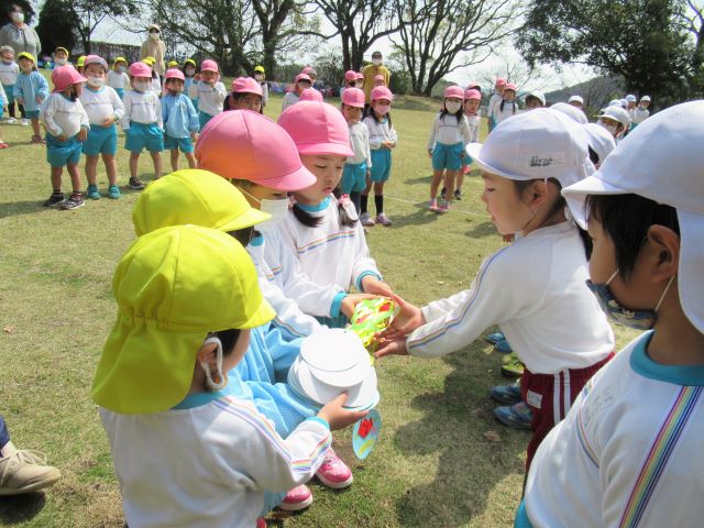 大好きな年長さんと一緒に最後の遠足。年中少さんから「今まで優しくしてくれてありがとう」「小学校でも頑張ってね」とプレゼント。 卒園して大きくなっても、大好きなグリーンスクールは子どもたちの心の故郷です。