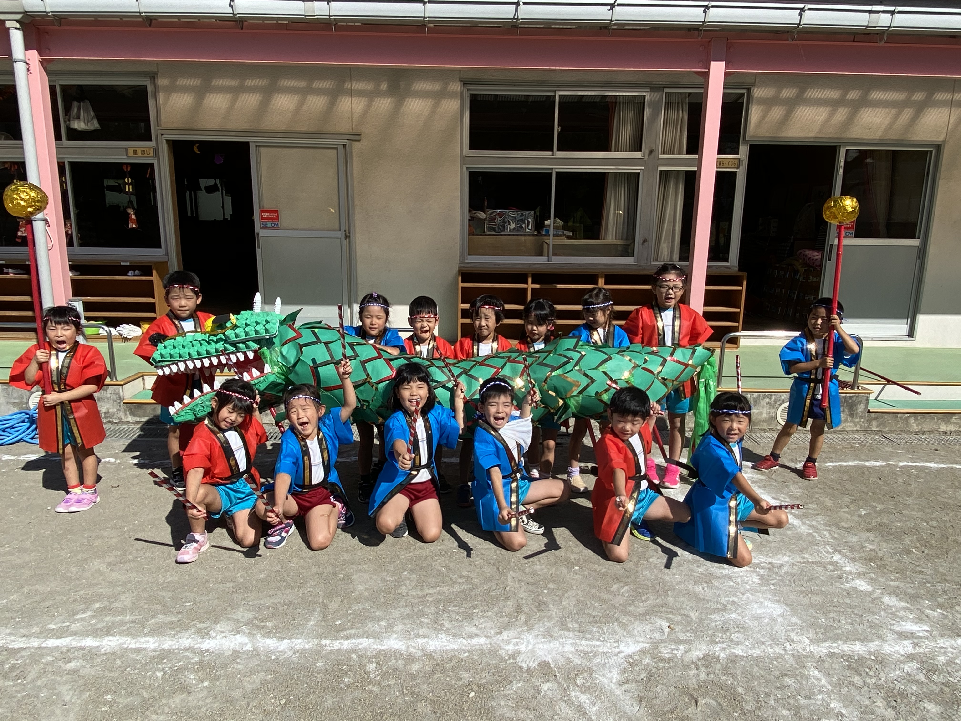 他の学年も手分けして制作を担当します。当日は、年長児お神輿をかつぎ、他の学年がお手製のうちわで仰いで応援してくれます。