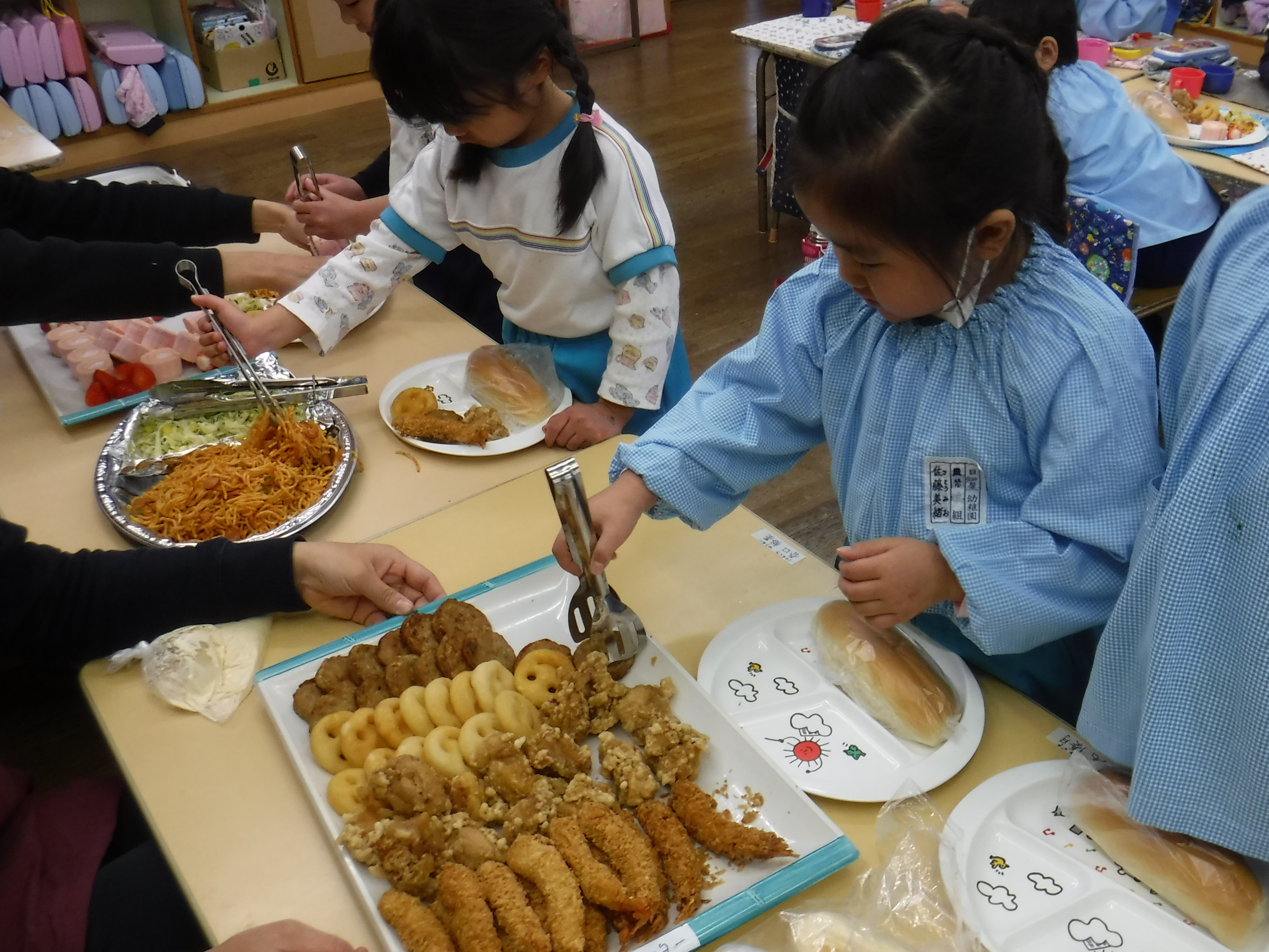 - 年に1度のバイキング給食があります。いつもと違う給食の雰囲気を味わいながら楽しみます。自分で食べられる量を考えながら、皿に盛ることが楽しいようです。