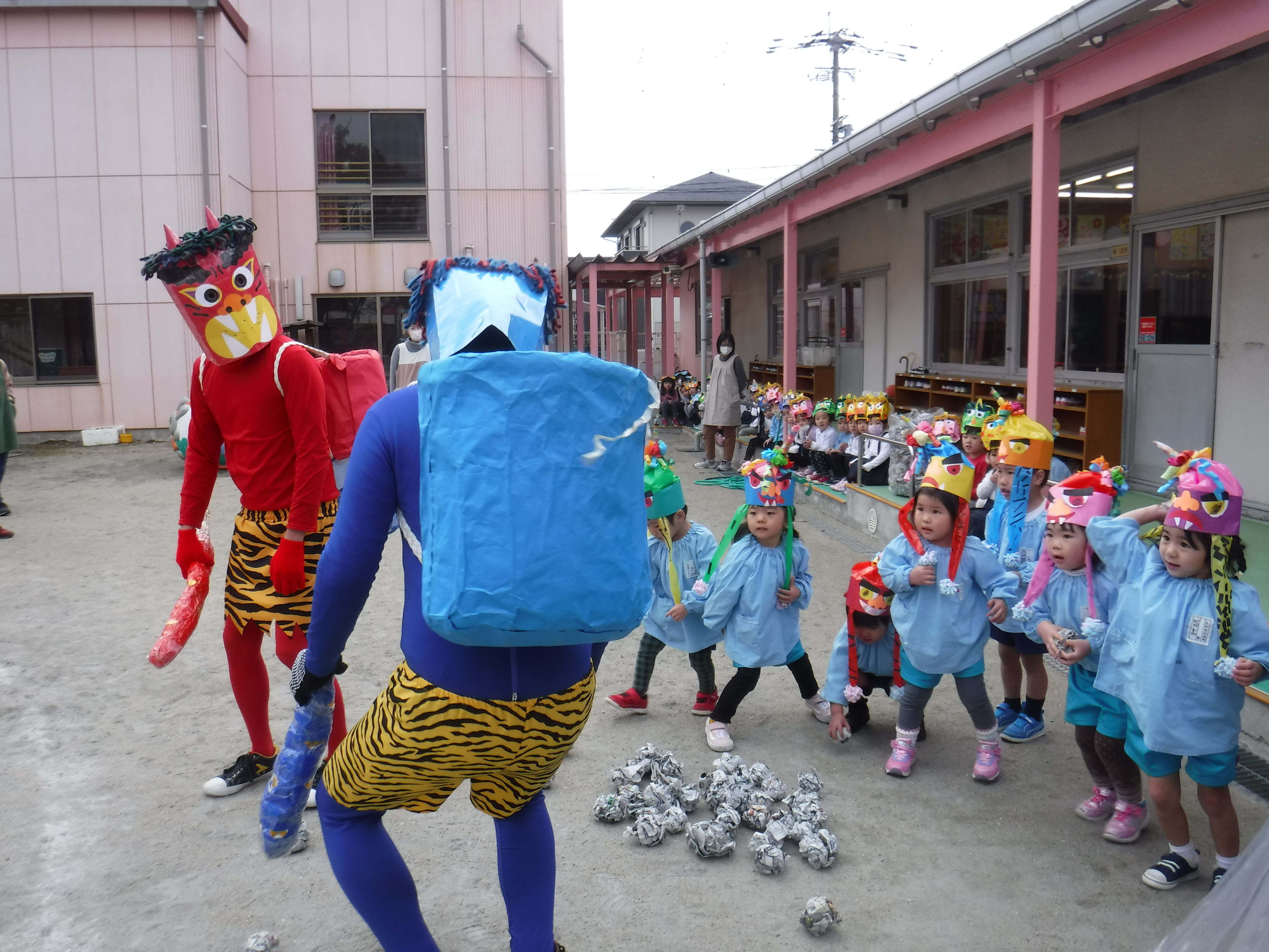 - 節分は、行事としても楽しいものですが、日頃の生活の姿、行動を振り返ってみる機会としても大切にしています。園児は、数日前から鬼の登場を気にかけている様子です。鬼が登場すると、様々な表情を見せてくれます。鬼退治の時には、園児の興奮することが考えられるので、安全に動ける環境を整えています。