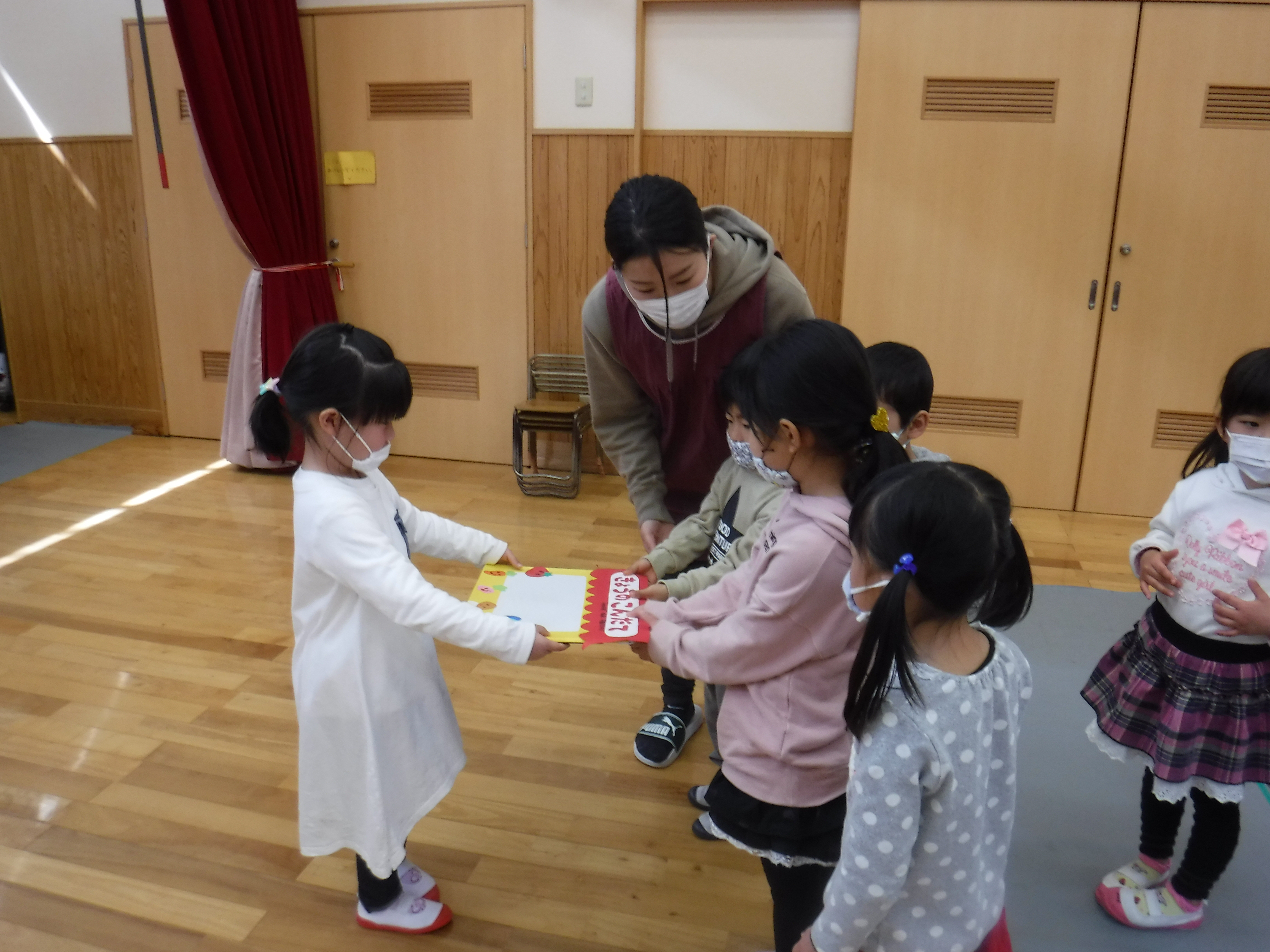 - 3月は別れの季節。卒園児、在園児それぞれの立場で、感謝の気持ちを込めて歌やお遊戯、メッセージなどを送ります。手作りのプレゼントを交換し合い、改めてお互いの存在を感じとります。お別れ会を境に、その年度が終わる、という雰囲気が一気に広がります。進級・進学を楽しみにする気持ちが膨らむよう、これまでの成長をたくさん認めながら1年間のまとめをしています。