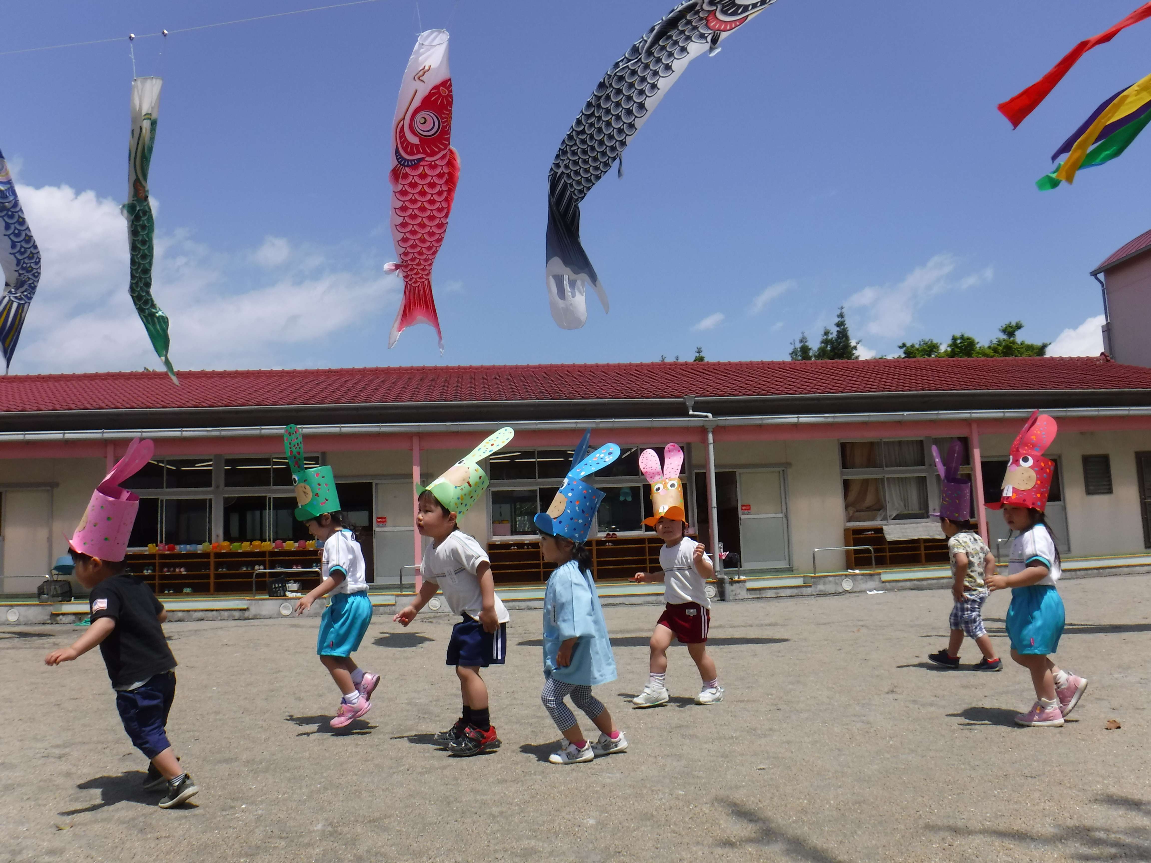 イースターの時期には、なじみの深い「うさぎ」に変身したり、イースターの卵を見つけたりして「あそび」に夢中になっていきます。また、母の日のプレゼントや、こいのぼりを制作します。園児たちは本物のこいのぼりと一緒に園庭中を駆けまわっています。