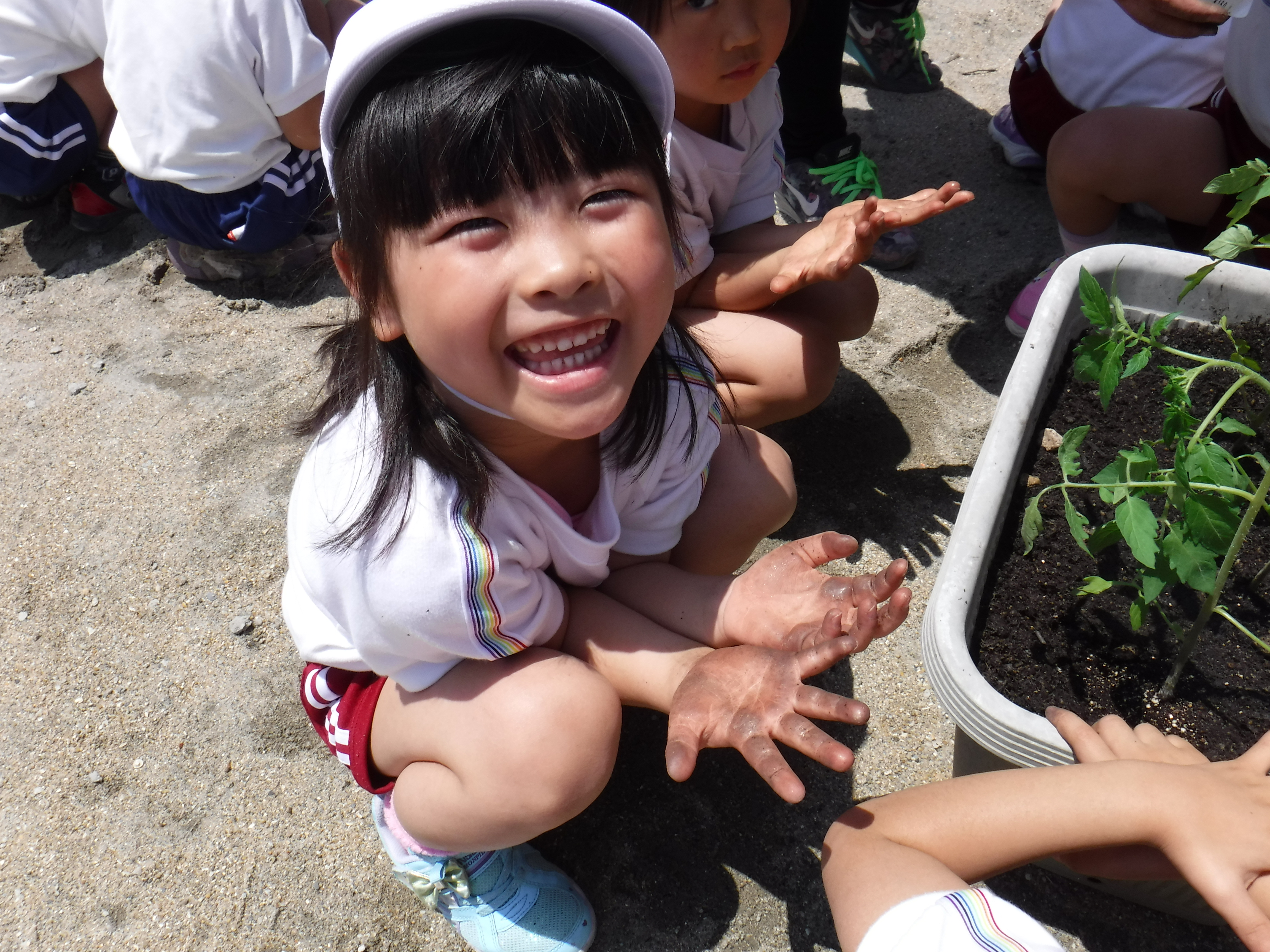 ゴールデンウイークが明けると、年長さんは、夏野菜の苗を担当ごとに植えます。朝の自由時間に、土と肥料を混ぜ、自分たちで、近くのお店に苗を買いに行きます。たくさんの種類の野菜を目にして、興味津々の様子です。買い出しから、土の用意、苗植えと一連の流れを通し、作物を作る期待や大変さや、見通しをもって計画を立てる大切さを経験しています。
