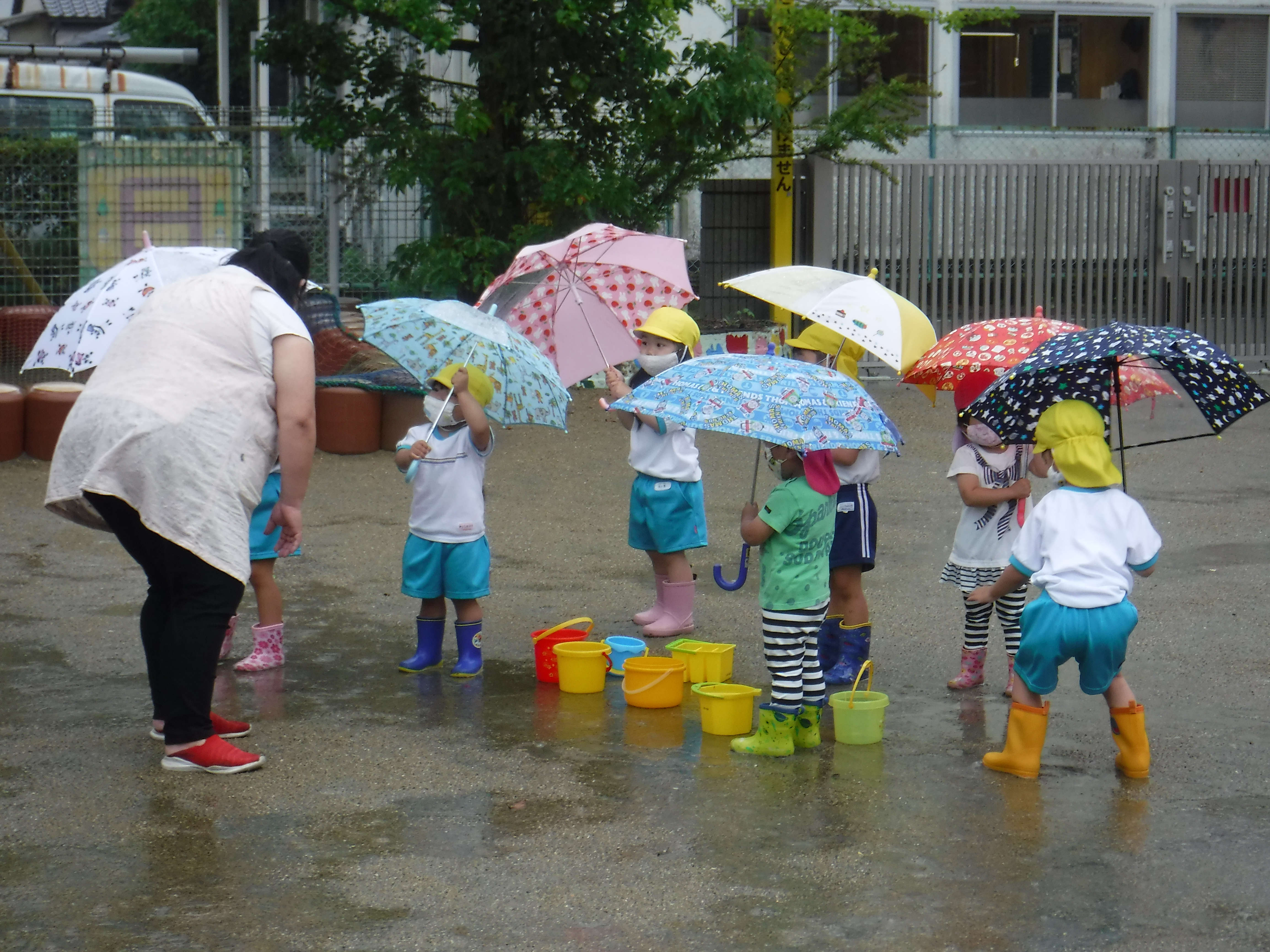 雨の日の園庭に傘をさして出てみると、普段とは少し違う園庭の様子を感じられます。水たまりや水の流れ具合が自然にできている様子に興奮する子どもたちです。地面を踏んだ時の感触や泥で足元を取られる具合が心地よく、さらにお気に入りの長靴や、傘が華やかさを増します。