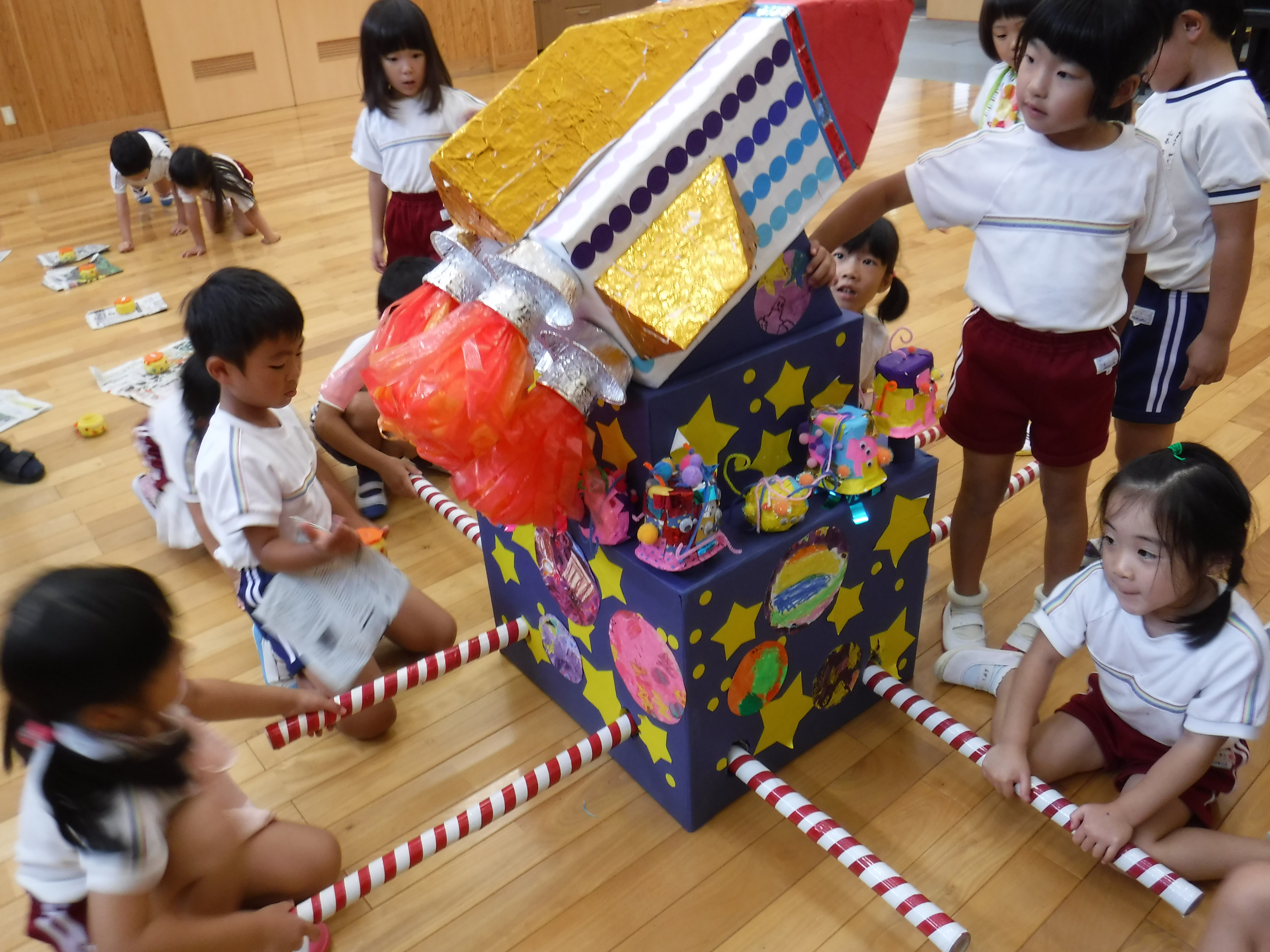 7月は、「夕涼み」の雰囲気を友達や先生と楽しみながら過ごしています。「夕涼み」で年長児がかつぐお神輿は、年長児を中心に話し合いを行い、テーマや構成を決め、制作を行います。