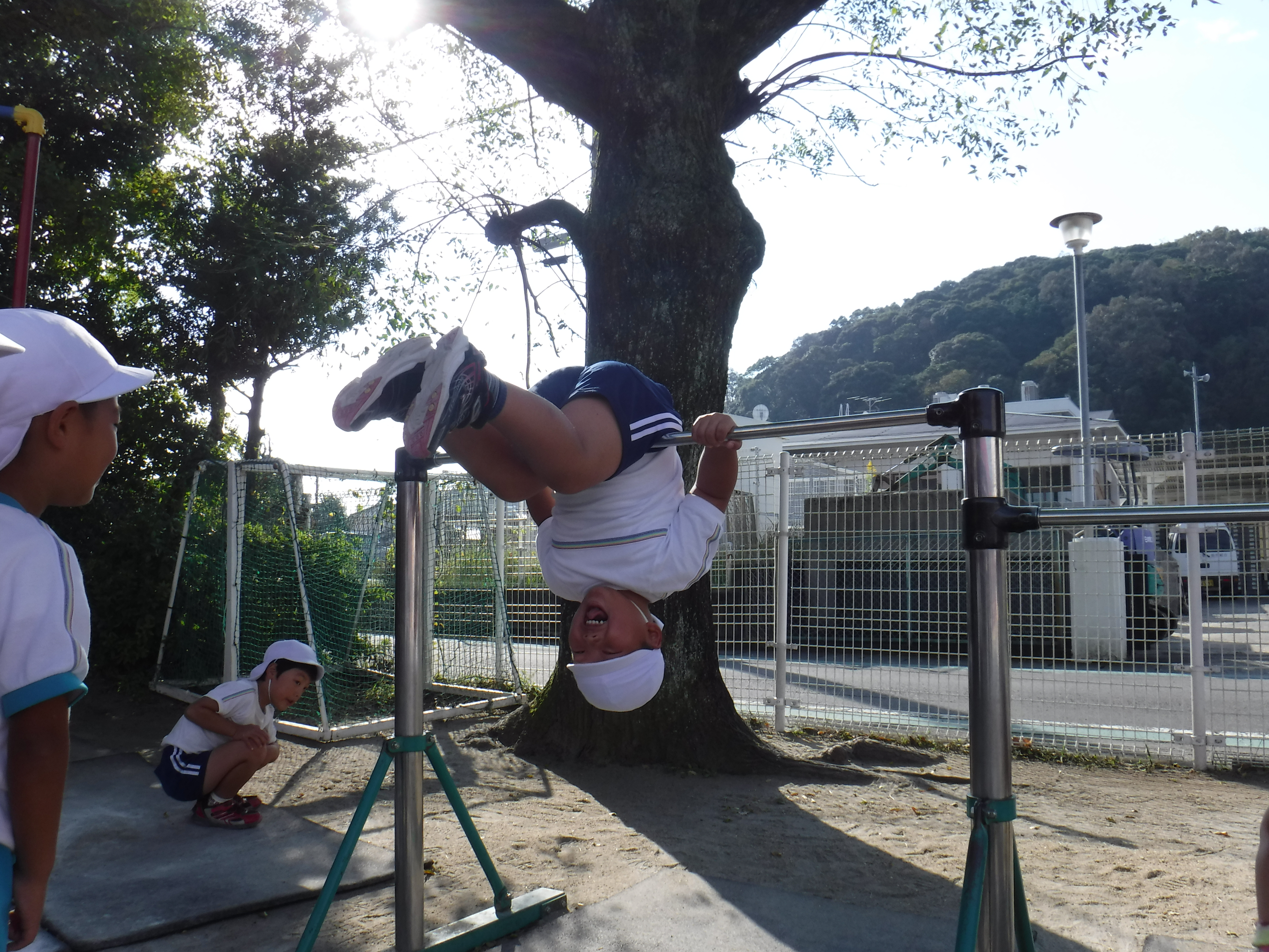 - 年長さんは、運動会で、「逆上がり」「鉄棒」に挑戦します。成功へ向けて頑張ろうと必死に取り組もうとする姿(「挑戦する」「必死になる」「自信をつける」など)を大切にしています。年中さんも、年長さんの逆上がりチャレンジをする様子を見て刺激を受けて、年中の時から練習しています。運動会当日にはできずとも、あきらめずに練習をしてできるようになるという、自分自身の目標に向けて懸命に取り組む姿も見られます。